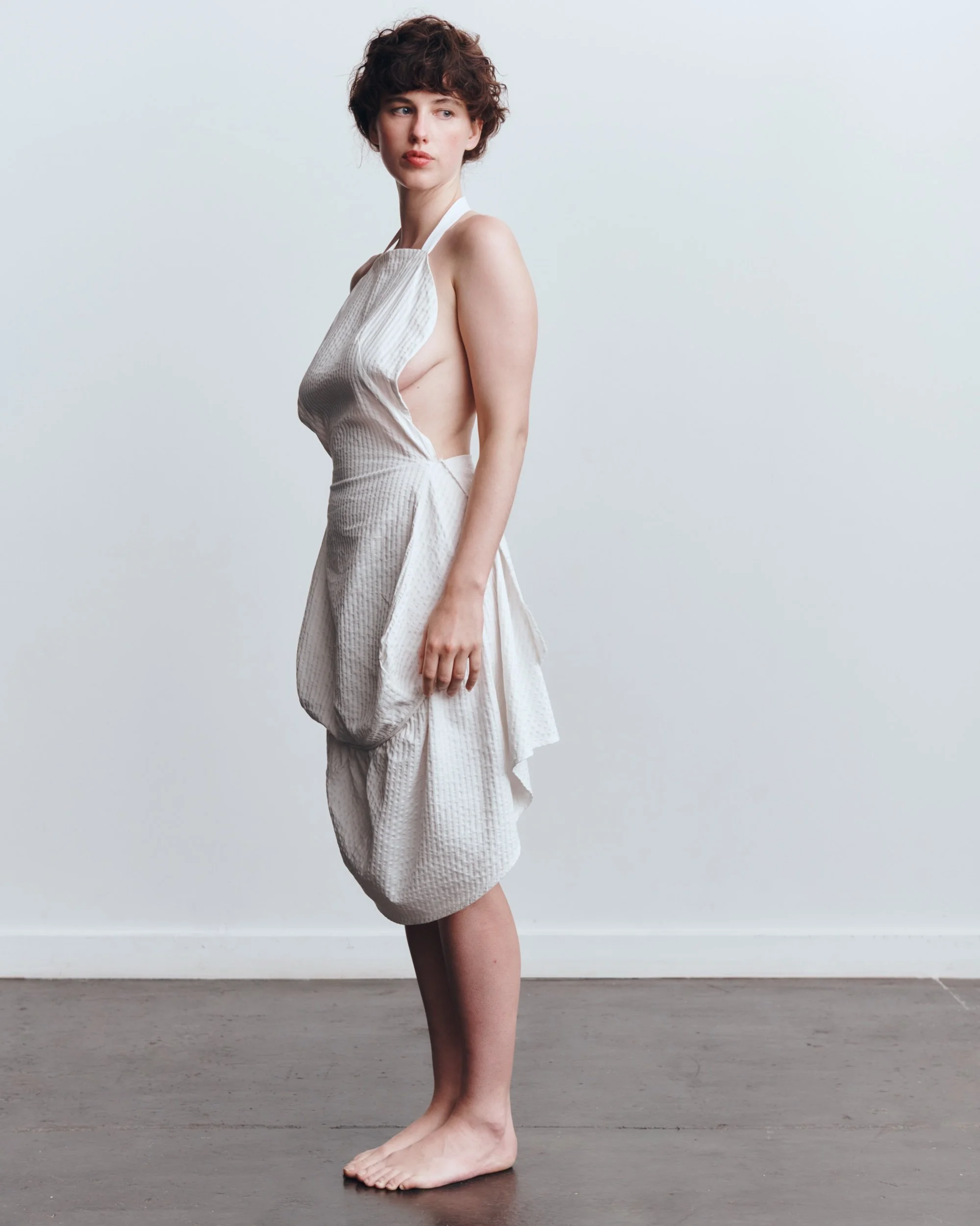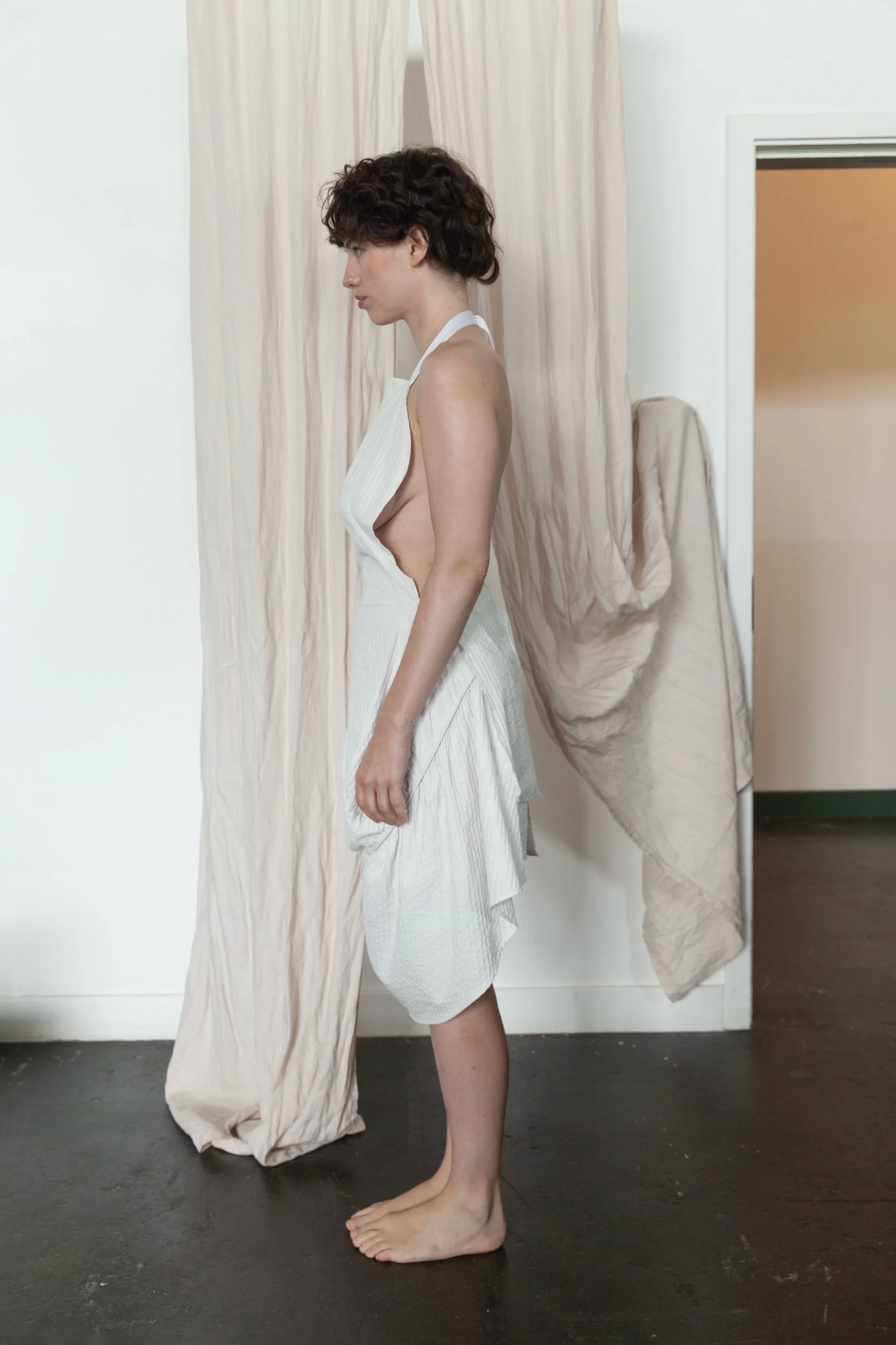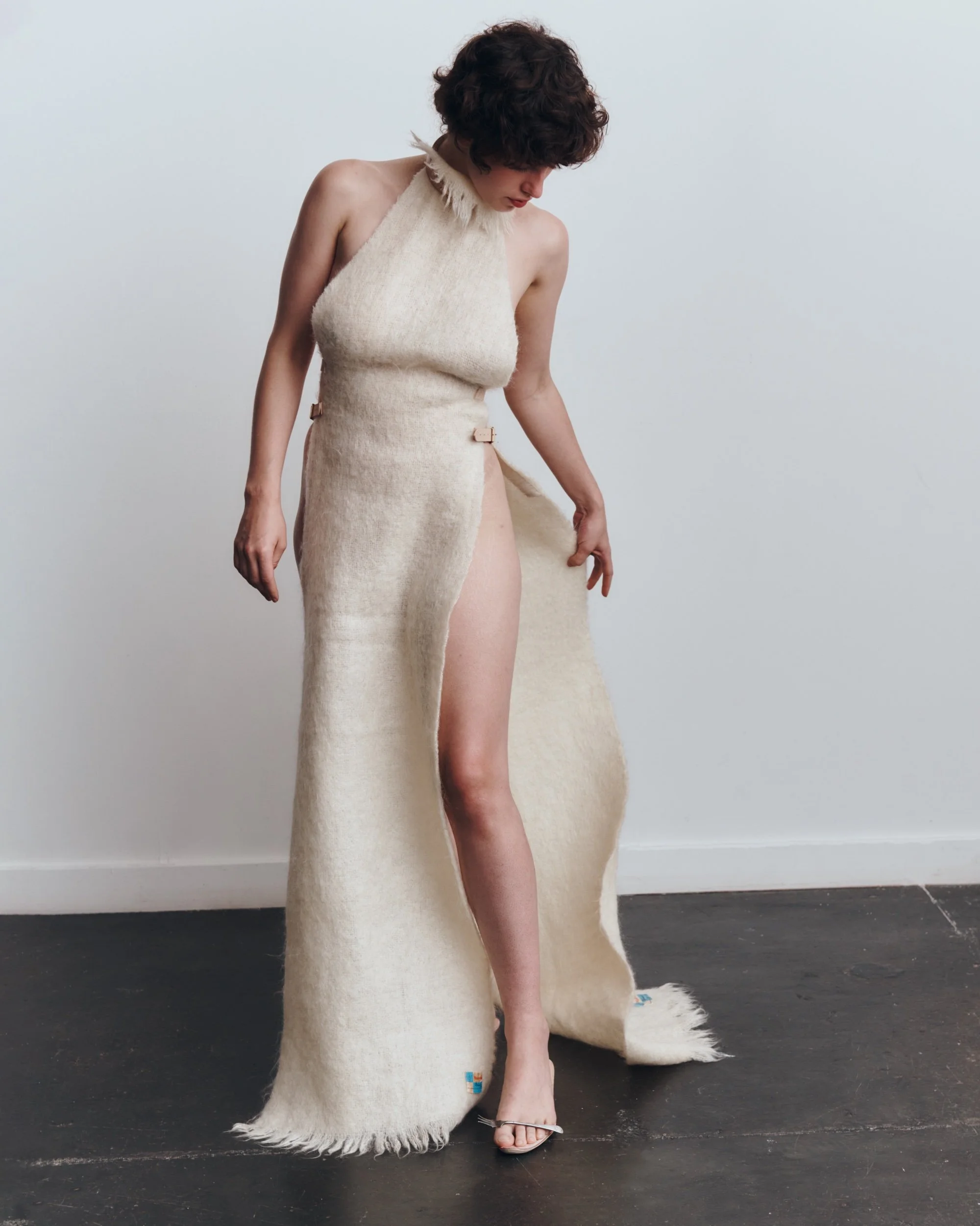 Vintage mohair scarves form a floor sweeping dress held together with leather straps and the embroidery hoop leather collar